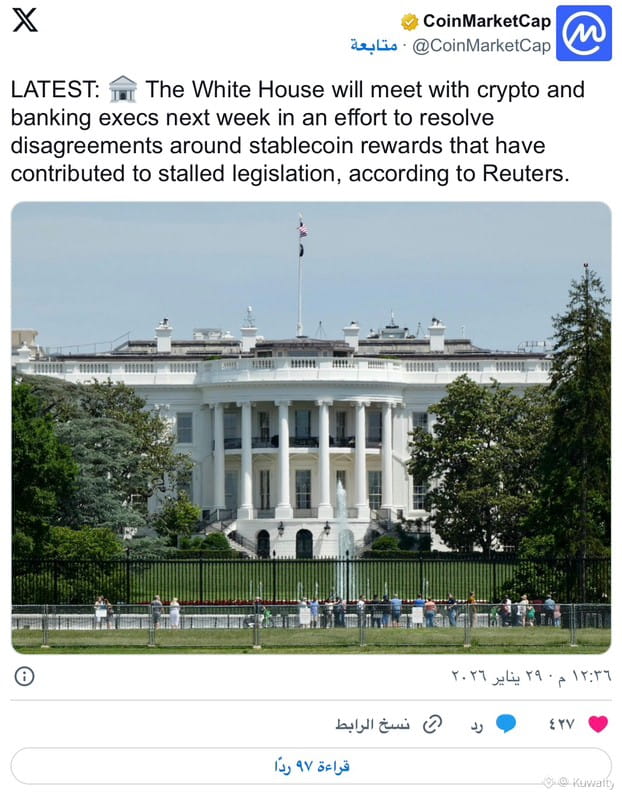 حسب التقارير، سيُعقد الاجتماع في 2 فبراير 2026. سيجلس كبار المسؤولين الحكوميين مع التنفيذيين من شركات العملات المشفرة والبنوك الكبرى في الولايات المتحدة، على أمل التوصل إلى أرضية مشتركة.