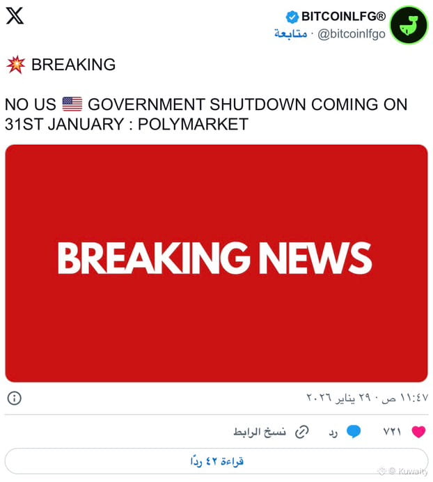 تشير بيانات Polymarket الآن إلى أن إغلاق الحكومة الأمريكية في 31 يناير يبدو غير محتمل. يعكس الانخفاض الحاد في الاحتمالات تراجع المخاطر السياسية، وتستجيب الأسواق إيجابياً لهذا التحول. ومع تلاشي حالة عدم اليقين، يستعيد المستثمرون تركيزهم، وتتنفس الأصول عالية المخاطر بسهولة أكبر، ويعود الاستقرار إلى السرد المالي.