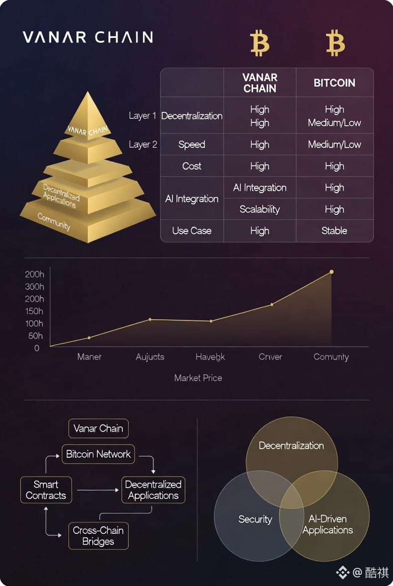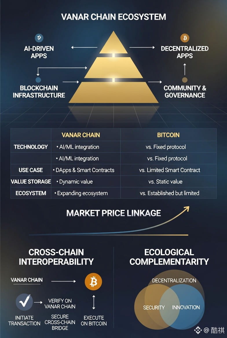 比特币是加密世界的基石:它以去中心化、安全、固定供应与抗审查特性,成为无可争议的数字黄金与全球价值锚定层。Vanar 高度尊重并认可这一基础价值——比特币的成功证明了去中心化信任的持久力量,也为整个生态铺平了道路。Vanar 的定位并非取代比特币,而是作为其自然延伸与互补层:在比特币提供底层信任与价值存储的基础上,Vanar 构建高效、智能的应用执行环境。