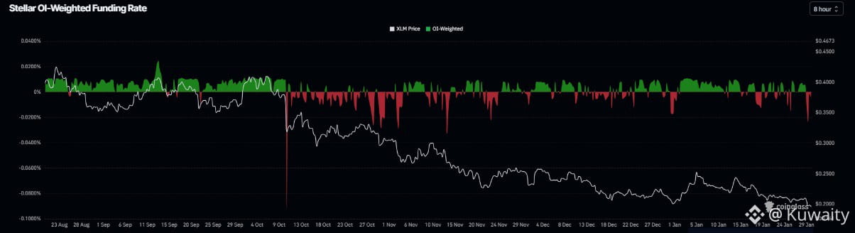 تدعم بيانات المشتقات لستيلر نظرة هبوطية. تُظهر بيانات معدل التمويل الموزون حسب الفائدة المفتوحة من CoinGlass أن عدد المتداولين الذين يراهنون على انخفاض سعر XLM أكبر من أولئك الذين يتوقعون زيادة في السعر. تحول المقياس إلى السلبية يوم الخميس ويقف عند -0.0049% يوم الجمعة، مما يشير إلى أن المراكز القصيرة تدفع للمراكز الطويلة ويقترح معنويات هبوطية تجاه XLM.