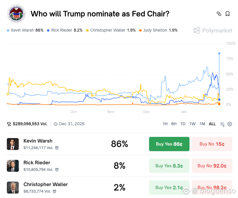Trước đó vào thứ Năm, thị trường dự đoán đã chuyển hướng về phía Warsh. Polymarket cho thấy Warsh có xác suất thắng là 87% với khối lượng giao dịch 289 triệu đô la. Kalshi cũng có tỷ lệ tương tự ở mức 86% với khối lượng giao dịch 74 triệu đô la.