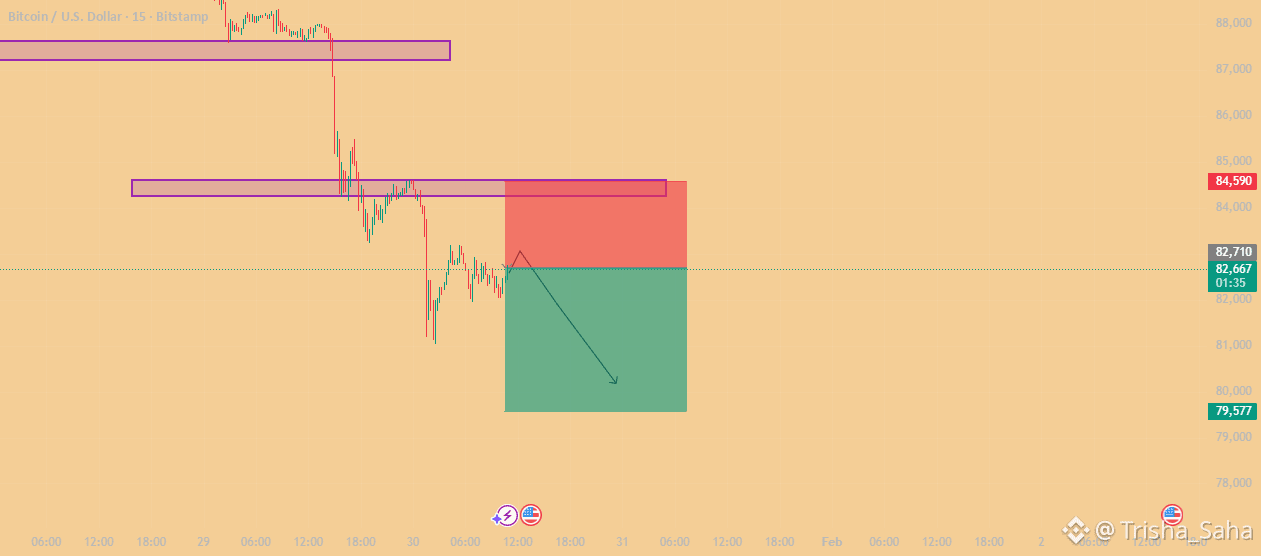 Bitcoin (BTC/USD) ne 15-minute timeframe par ek bari structural change dikhayi hai, jahan price ne pichle institutional support levels ko decisively breakdown kar diya hai. Market sentiment ab consolidation phase se aggressive downward expansion ki taraf shift ho chuka hai.