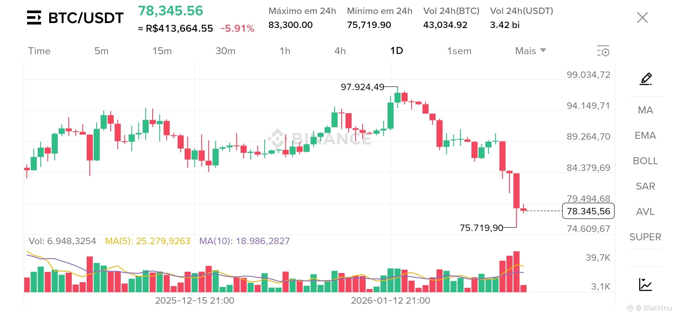 Queda de preço: BTC caiu para US$ 78.175 após atingir mínimas de US$ 75.000, recuando 6,5% em 24h