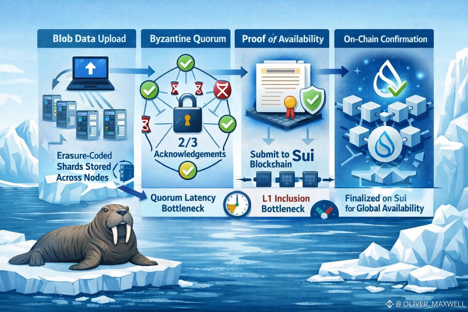 Then you stack L1 inclusion on top of that. Even if you collect 2/3 acknowledgements quickly, the write is not final until the certificate is published and confirmed on Sui, meaning the system cannot treat the blob as globally committed and safely referenceable under the same availability guarantee before that point. That means Walrus inherits a throughput ceiling that matters under sustained writes when certificate inclusion is the gating step, and that ceiling is driven by how many certificates Sui can absorb and finalize under real load, not how much aggregate storage bandwidth Walrus has. If your mental model is “Walrus scales when we add more storage nodes,” you miss the hard dependency: adding storage capacity does not automatically add certificate finality capacity.