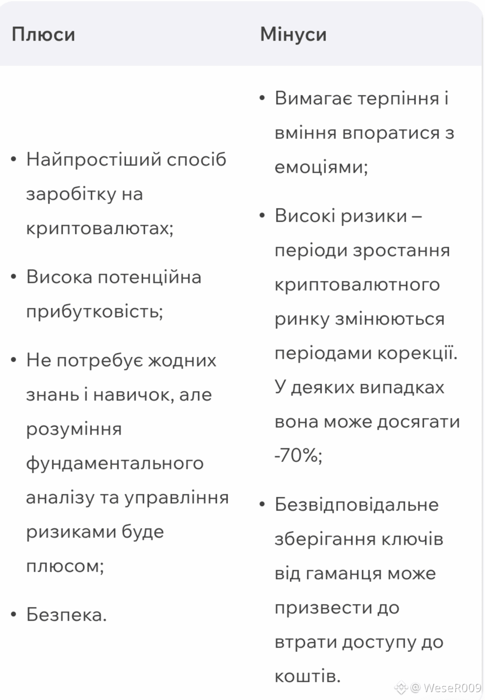 Інвестування поєднує в собі простоту і високу потенційну прибутковість, що підходить навіть новачкам. Але цей спосіб – довгостроковий. Будьте готові до того, що курс може коригуватися протягом тривалого часу. Якщо ви готові зберігати криптовалюту 3-5 років і чекати, коли її курс зросте, то спосіб вам підходить. Для короткострокових і середньострокових інвесторів плюсом буде вміння розбиратися у фундаментальному аналізі, а також відстежувати тренди.