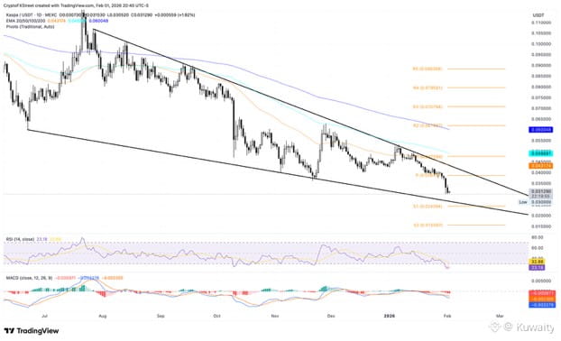 يقترب كاسبا من 0.3000 دولار في وقت كتابة التقرير يوم الاثنين، مستمرًا في تراجعه بعد خسارة بنسبة 22% الأسبوع الماضي. يقترب الاتجاه الهابط في KAS من خط دعم نمط إسفين هابط على الرسم البياني اللوغاريتمي اليومي، بالقرب من نقطة المحور S1 عند 0.02439 دولار.