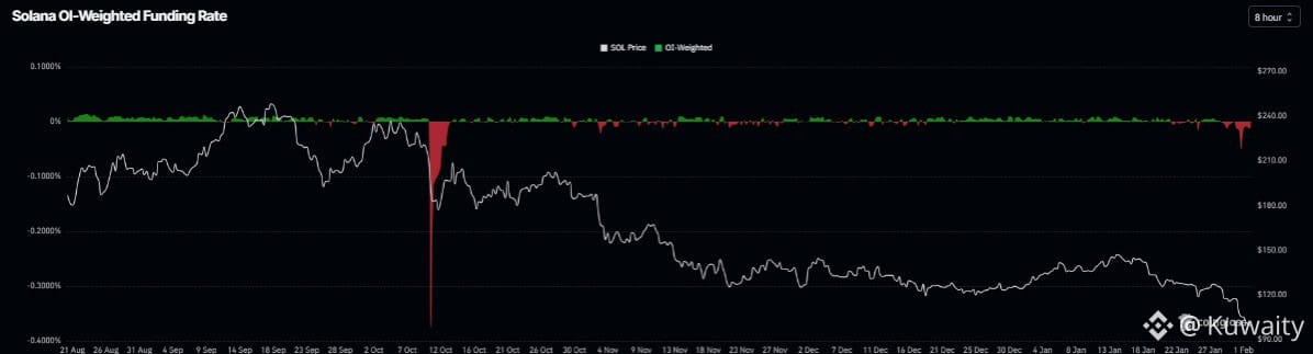 تدعم بيانات المشتقات لسولانا نظرة هبوطية. تُظهر بيانات معدل التمويل المرجح من Coinglass أن عدد المتداولين الذين يراهنون على انخفاض سعر SOL أكبر من أولئك الذين يتوقعون زيادة في السعر.