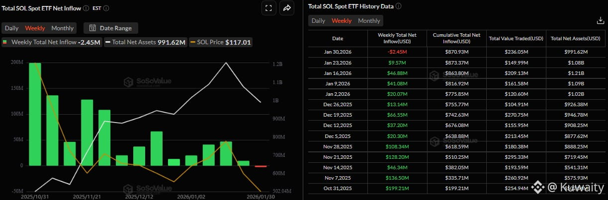 تراجع الطلب المؤسسي على سولانا أيضًا في الأسبوع الماضي. أظهرت بيانات SoSoValue أن صناديق الاستثمار المتداولة في البورصة (ETFs) سجلت تدفقات خارجة بقيمة 2.45 مليون دولار في الأسبوع الماضي، مما يمثل أول سحب أسبوعي منذ إطلاقها. إذا استمرت هذه التدفقات الخارجة وتزايدت، فقد يصحح SOL بشكل أكبر.