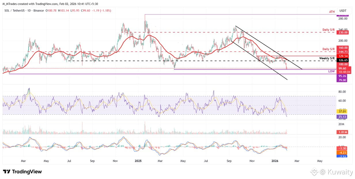 تم رفض سعر $SOL عند المقاومة الأسبوعية عند 126.65 دولار يوم الأربعاء وانخفض بأكثر من 15% حتى يوم الأحد، لينزلق دون المستوى النفسي الرئيسي 100 دولار. اعتبارًا من يوم الاثنين، يتم تداول SOL عند 99.60 دولار.