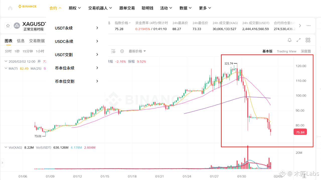这也是为什么你会看到 ETF 端的表现同样剧烈——iShares Silver Trust (SLV)在 1/31 的收盘价约 75.44 美元,单日跌幅极端;黄金 ETF 端也出现明显回撤。