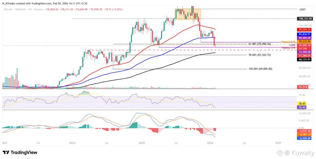 أغلق الرسم البياني الأسبوعي للبيتكوين دون المتوسط المتحرك الأسي لمدة 200 أسبوع عند 85836 دولار ومستوى تصحيح فيبوناتشي 61.8% (المستخرج من أدنى مستوى في أغسطس 2024 عند 49000 دولار إلى أعلى مستوى تاريخي في أكتوبر 2025 عند 126199 دولار) عند 78490 دولار الأسبوع الماضي.