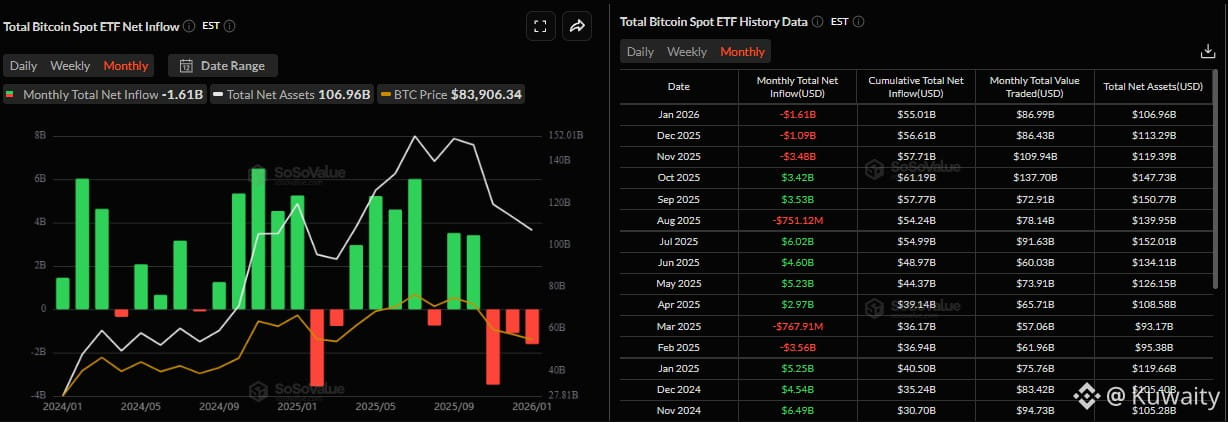 تم دعم انخفاض سعر البيتكوين بشكل أكبر من خلال تراجع الطلب المؤسسي. يظهر الرسم البياني SoSoValue أدناه أن صناديق الاستثمار المتداولة في البيتكوين الفوري (ETFs) سجلت تدفقات خارجة إجمالية بقيمة 1.49 مليار دولار الأسبوع الماضي، مما يمثل ثاني أسبوع متتالي من التدفقات الخارجة. على الرسم البياني الشهري، بلغت عمليات السحب في يناير 1.61 مليار دولار، مما يمثل ثالث شهر متتالي من التدفقات الخارجة. إذا استمر الطلب المؤسسي في الضعف والتصاعد، فقد يشهد BTC مزيدًا من التصحيح.