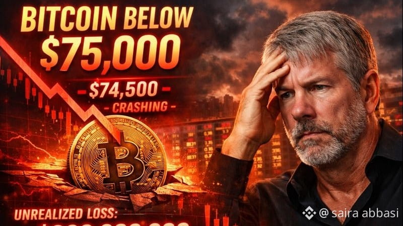 Bitcoin has dropped below $USDT 75,000, slipping under Strategy’s average purchase price of roughly $76,000 per BTC. With that key level broken, Michael Saylor’s massive Bitcoin position has moved firmly into the red.