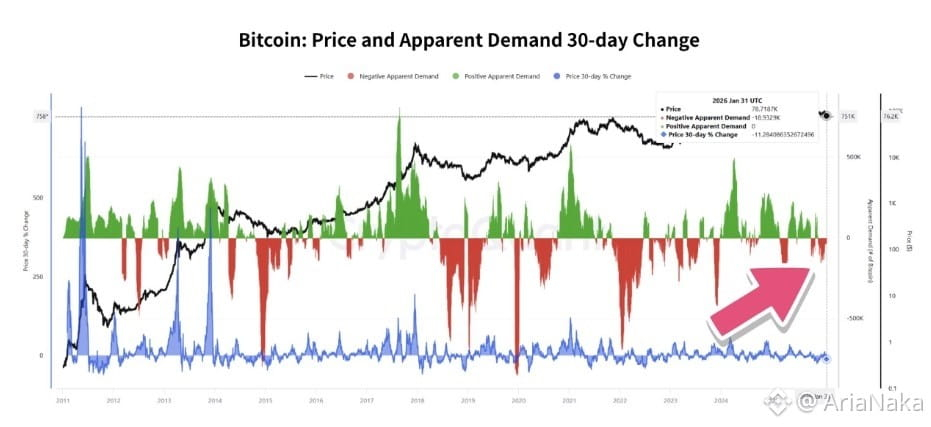The 30-day change in $BTC Apparent Demand is showing early signs of stabilization after an extended period of negative readings.
