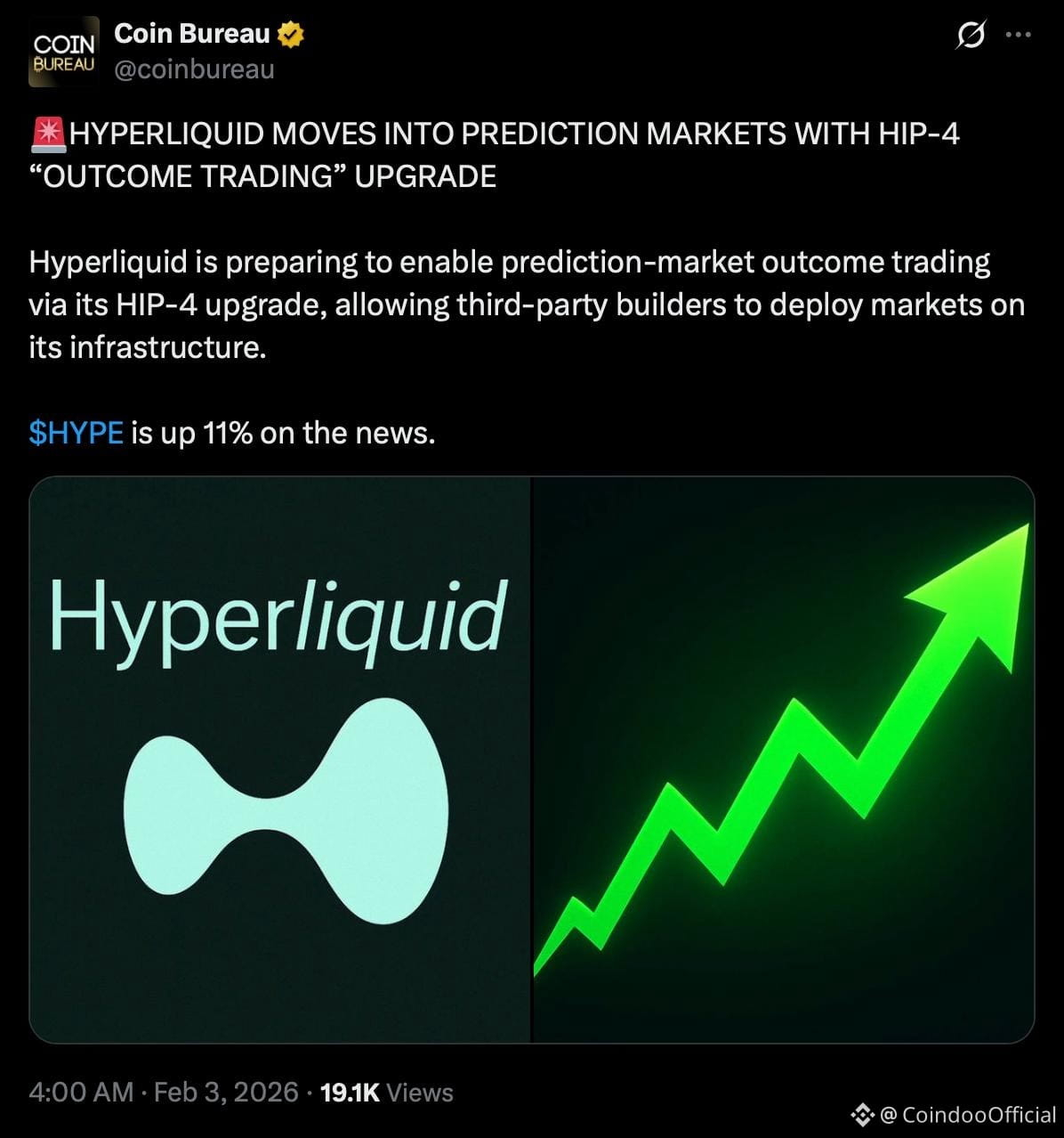 The HIP-4 upgrade is designed to support outcome-based markets, enabling users to trade on the probability of real-world events directly on Hyperliquid’s high-performance infrastructure. By opening the system to external builders, Hyperliquid is effectively creating a framework where prediction markets can be launched permissionlessly, while still benefiting from the protocol’s deep liquidity and low-latency execution.