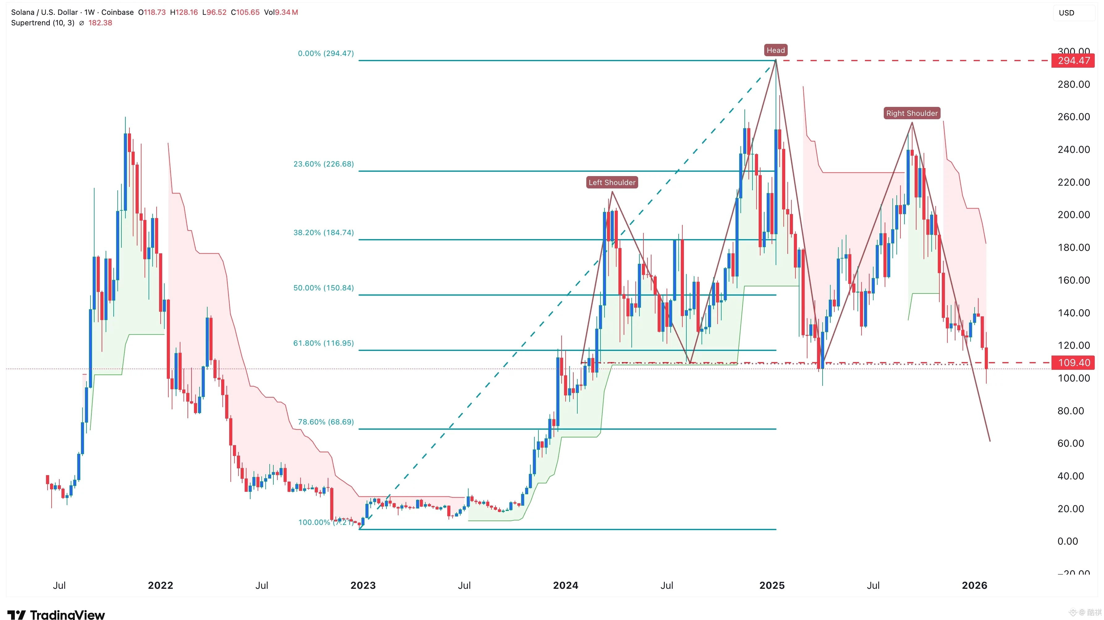 但周线级别仍呈现明显的头肩顶/熊市通道特征,Supertrend 指标仍处于空头压制状态,短期内下行风险大于上攻空间。