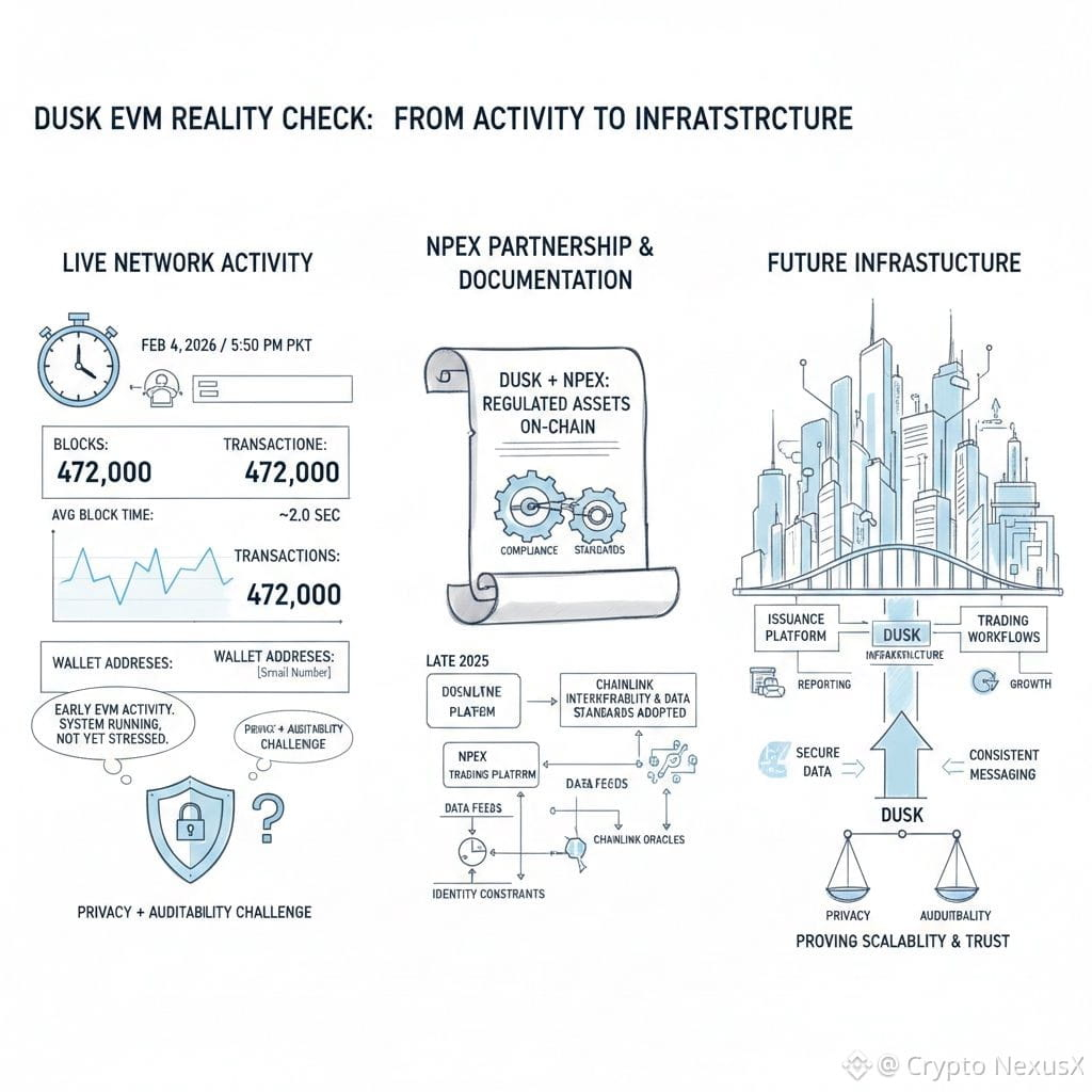 If you want an honest reality check, you look at live network activity, not just design. On the DuskEVM explorer, the public stats show the chain is producing blocks at around a 2.0 second average block time, with roughly 472 thousand blocks and 472 thousand transactions listed at the time of viewing, and a small wallet address count displayed. I am not going to twist that into a victory speech. It reads like a system that is running and being used, but still early in visible EVM activity. In an institutional context, early and controlled is not always a weakness, but it does raise the bar for what comes next: proving the rails can handle real issuance, trading workflows, reporting requirements, and growth without losing the privacy and auditability balance.