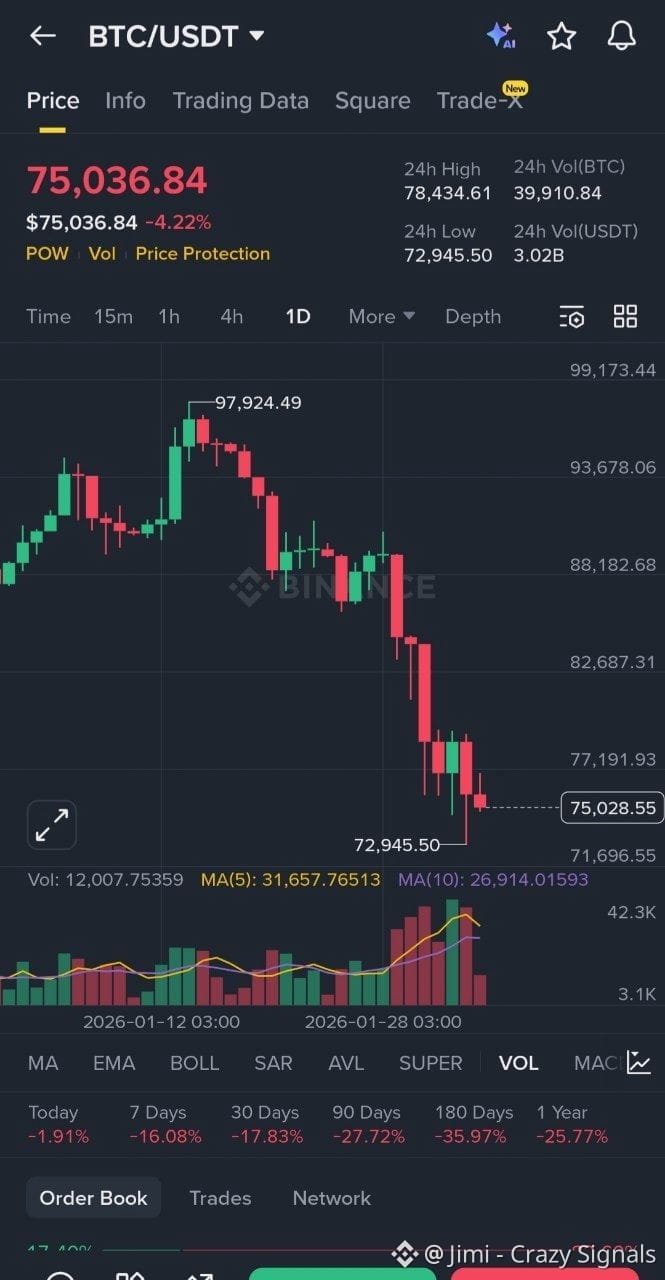 يا جماعة، اللي كنا نحذر منه صار.. كسرنا حاجز الـ 74,000 دولار أمس، وهذا المستوى كان آخر أمل لـ "الثيران" عشان يثبتون إننا لسه في سوق صاعد. الحين، الكل بدى يقتنع فعلياً إننا في قلب "البير ماركت" (Bear Market).