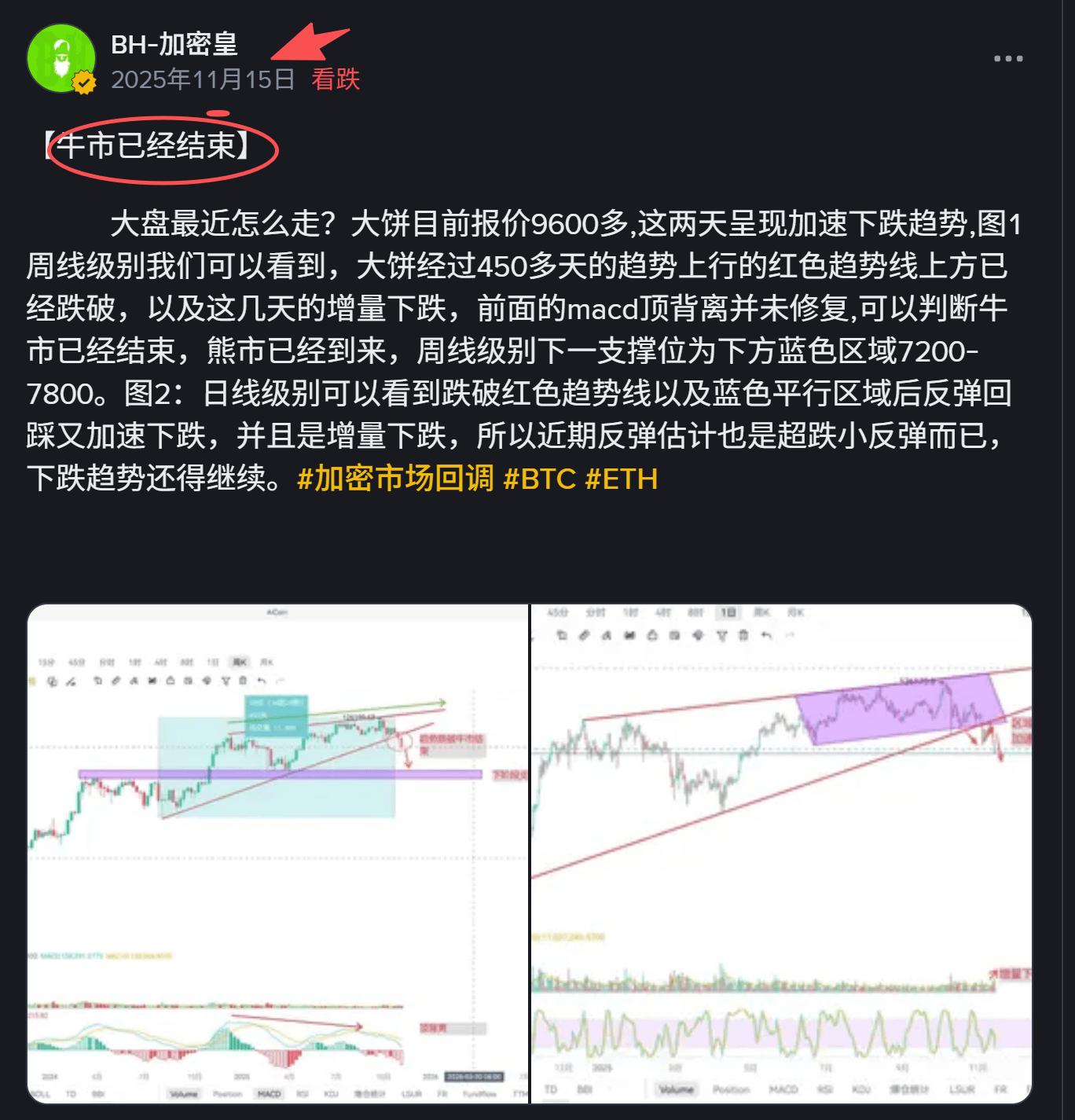 我们再来回顾一下,这段时间,从11月初我账号时隔两年恢复更新的第一条帖子出来看下图就是提醒‘牛市已经结束’,然后不断提醒高空思路,警惕诱多行情。