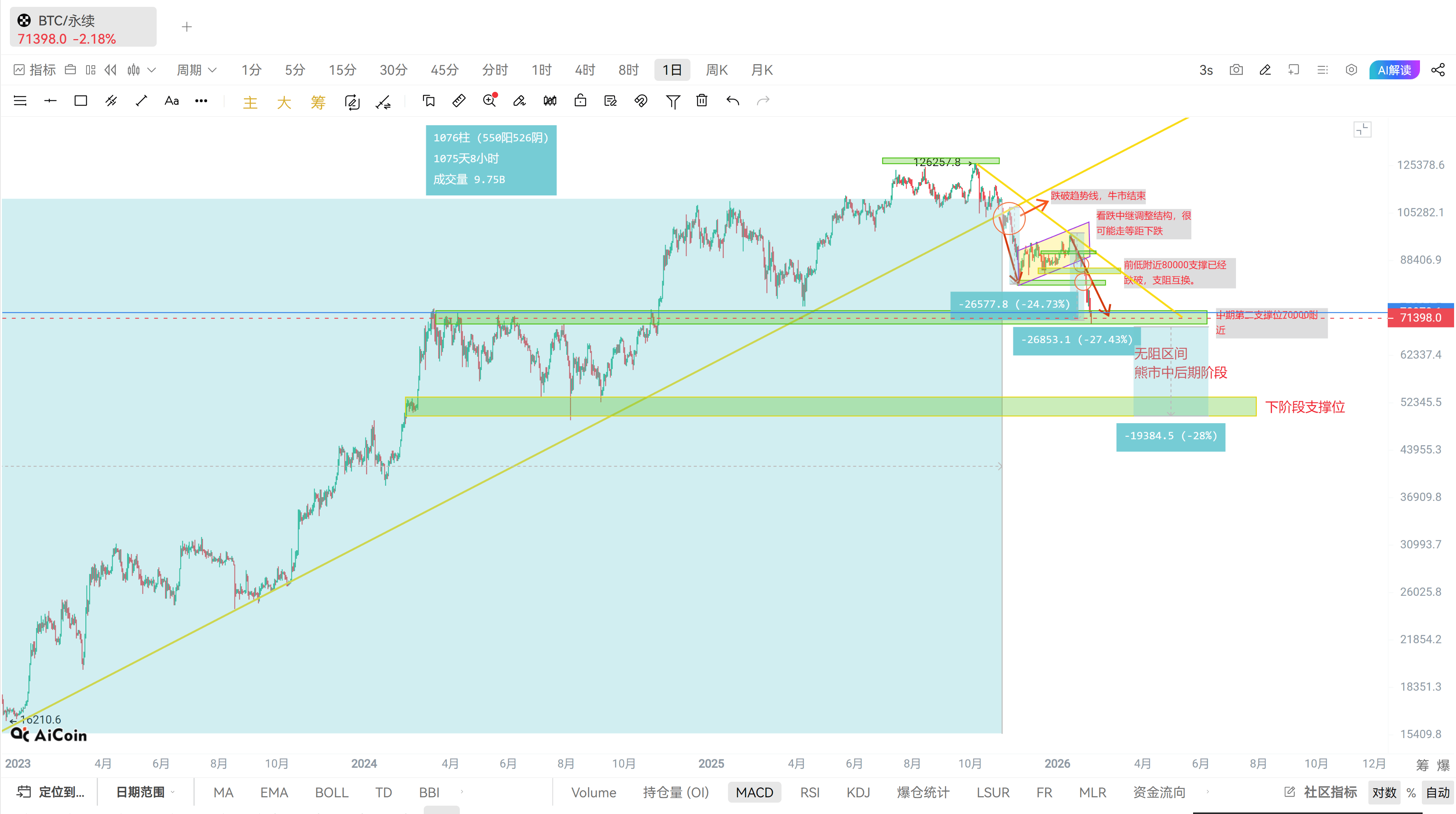 那么目前大盘情况我们来看下,目前报价71000+。看下图,一目了然,大饼从11月初跌破长周期上涨趋势线后,宣告牛市结束,然后迅速下跌到80000附近再反弹到98000附近,形成看跌中继结构后再走一个等距下跌到70000附近,目前我们看反弹位置上方74500,80000附近两个压力位可以作为高空点位,下方如果大饼跌破68000附近位置不能迅速收回,则进入下阶段无阻区间,熊市下一阶段,将会去到50000附近。