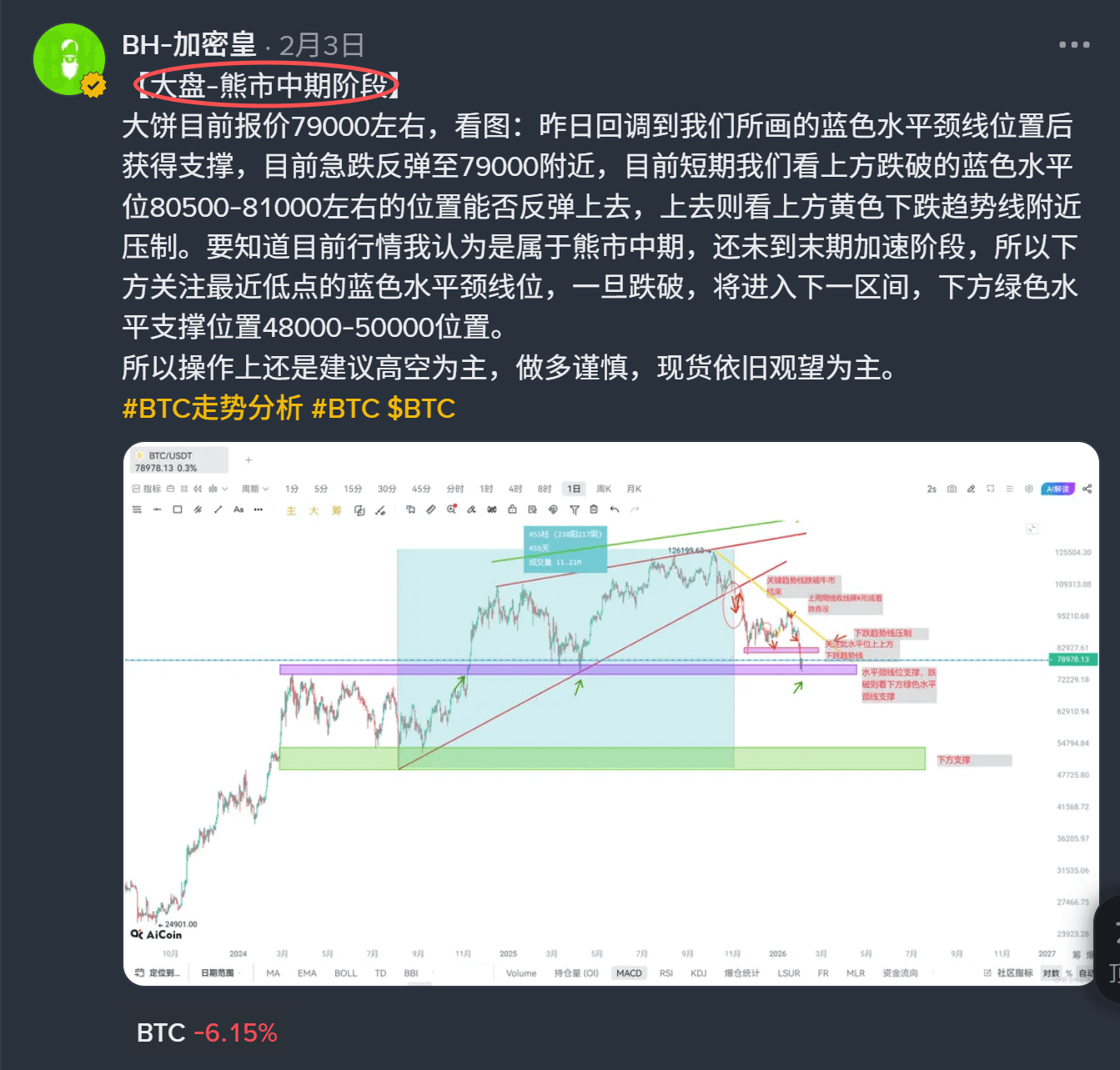 1月底开始我也一直提醒,大盘形成中继下跌结构,很可能走等距下跌到70000附近,而且目前属于熊市中期,目前完美复刻我们的分析走势。