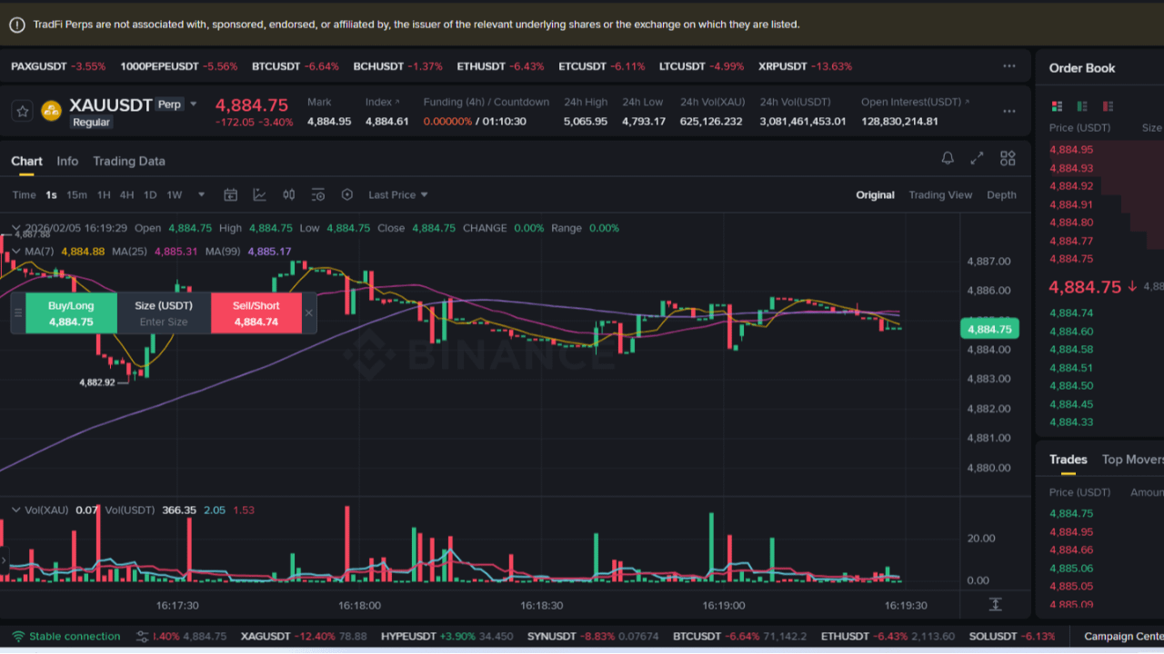 The screenshot shows a Binance futures chart for XAUUSDT Perpetual (Gold vs USDT) at approximately $4,884.75, with the price appearing stable or flat in the very short term (last price matches mark price, 0.00% change shown in the recent candle). The chart displays: