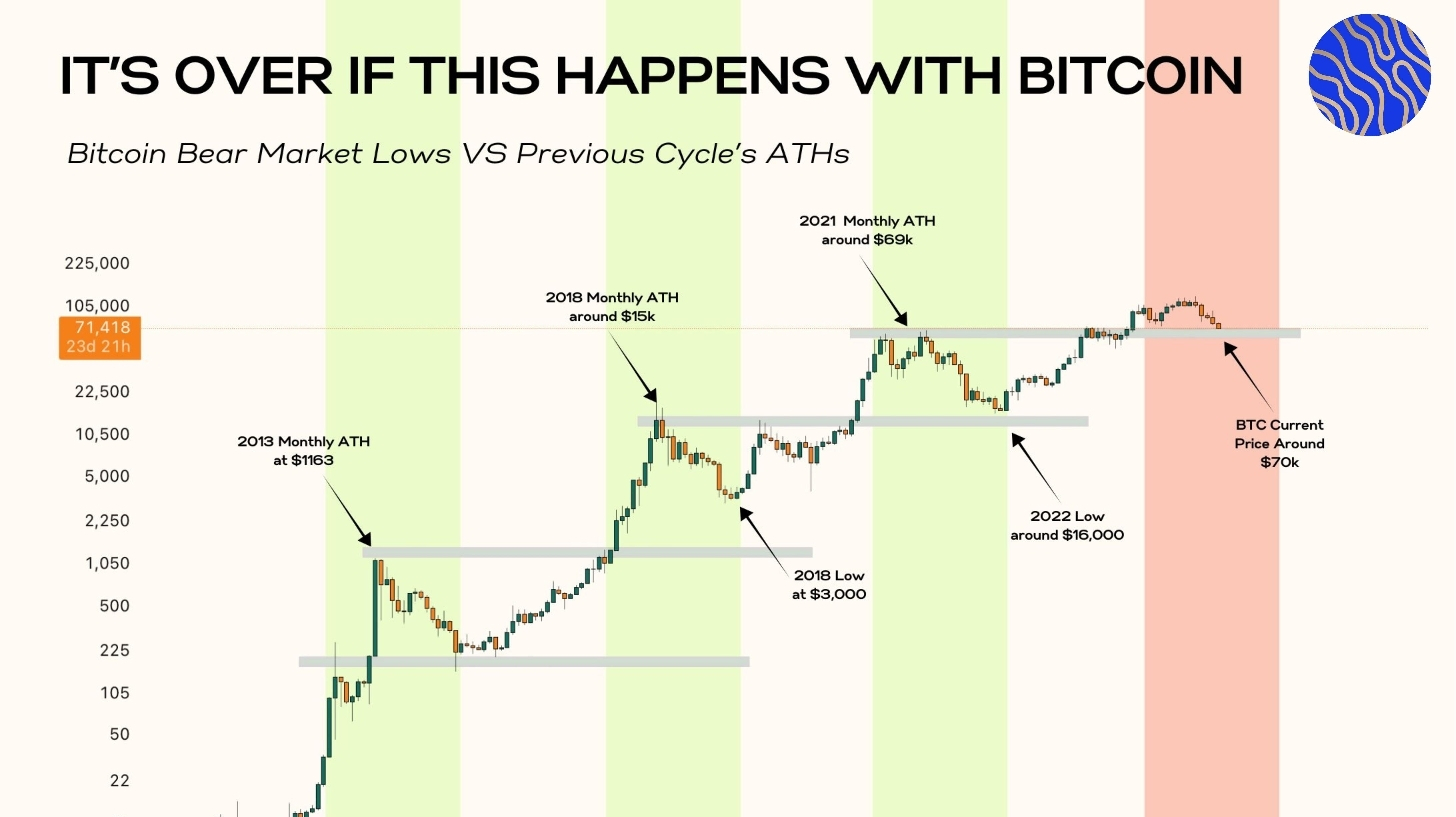 In 2014, the bear market bottom respected the 2013 peak. In 2018, price bottomed well above the 2013 ATH. In 2022, despite one of the most violent macro drawdowns ever, Bitcoin still held above the 2017 ATH around $20k on a macro basis.
