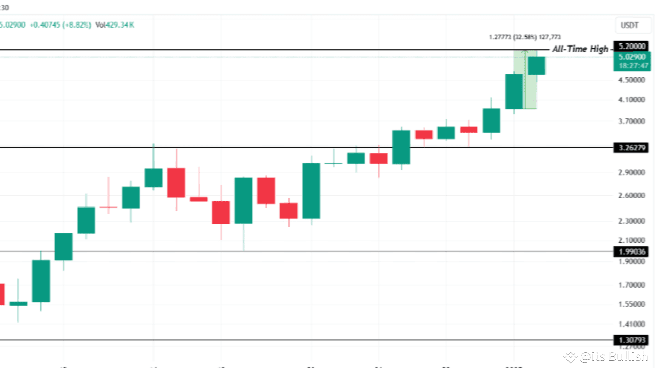 VIRTUAL posted a remarkable 32% gain in the past 24 hours, reaching a new peak of $5.20 before settling at $5.02. This performance has solidified its position as a top-performing altcoin, with growing investor interest fueling optimism about its potential to climb even higher. Analysts point to $6.00 as a possible next target if the bullish sentiment persists.