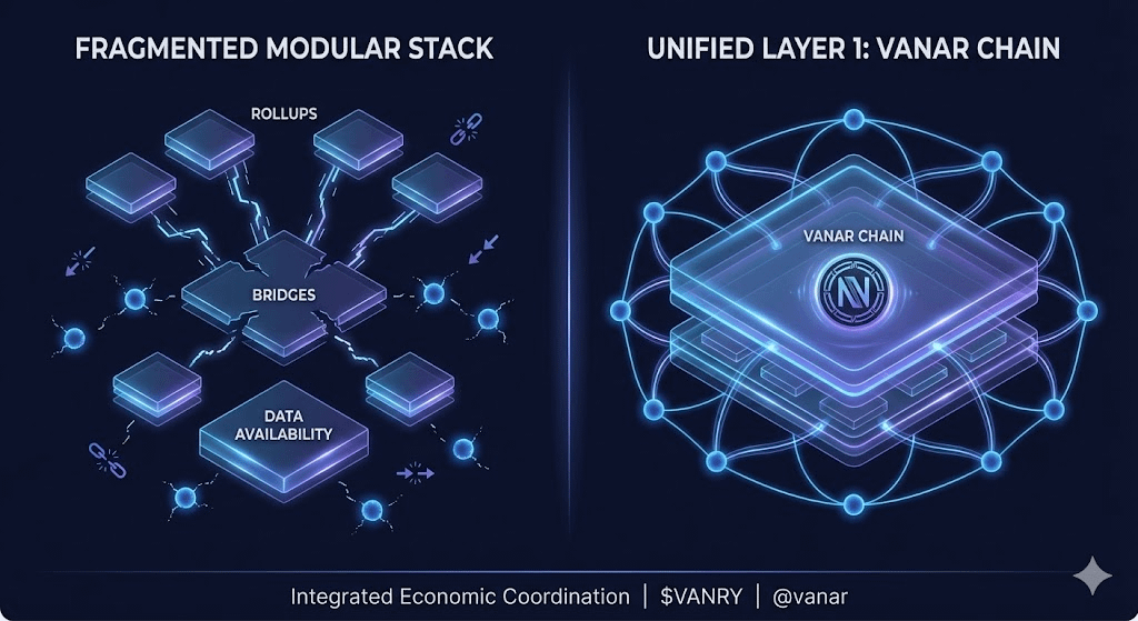 @Vanarchain is addressing this shortcoming in another way. It does not maximize component separation instead, it has the majority of functions within a single Layer-1 blockchain. The concept is workable individuals embrace a network not as much because of raw speed but as a result of a coherent and integrated system.