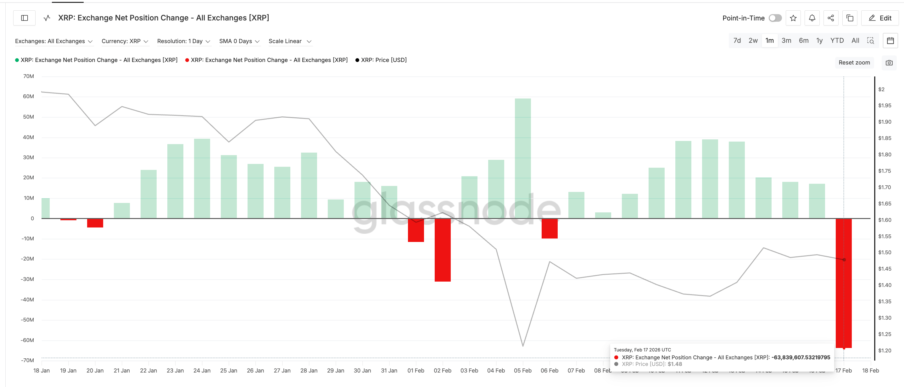 Despite the bearish short-term pattern, on-chain data reveals aggressive accumulation from sophisticated market participants. Exchange net position change flipped dramatically on February 17, showing approximately 63.8 million XRP leaving trading platforms—the largest single-day outflow in weeks. At current valuations, this represents roughly $92 million in tokens moving to private wallets.