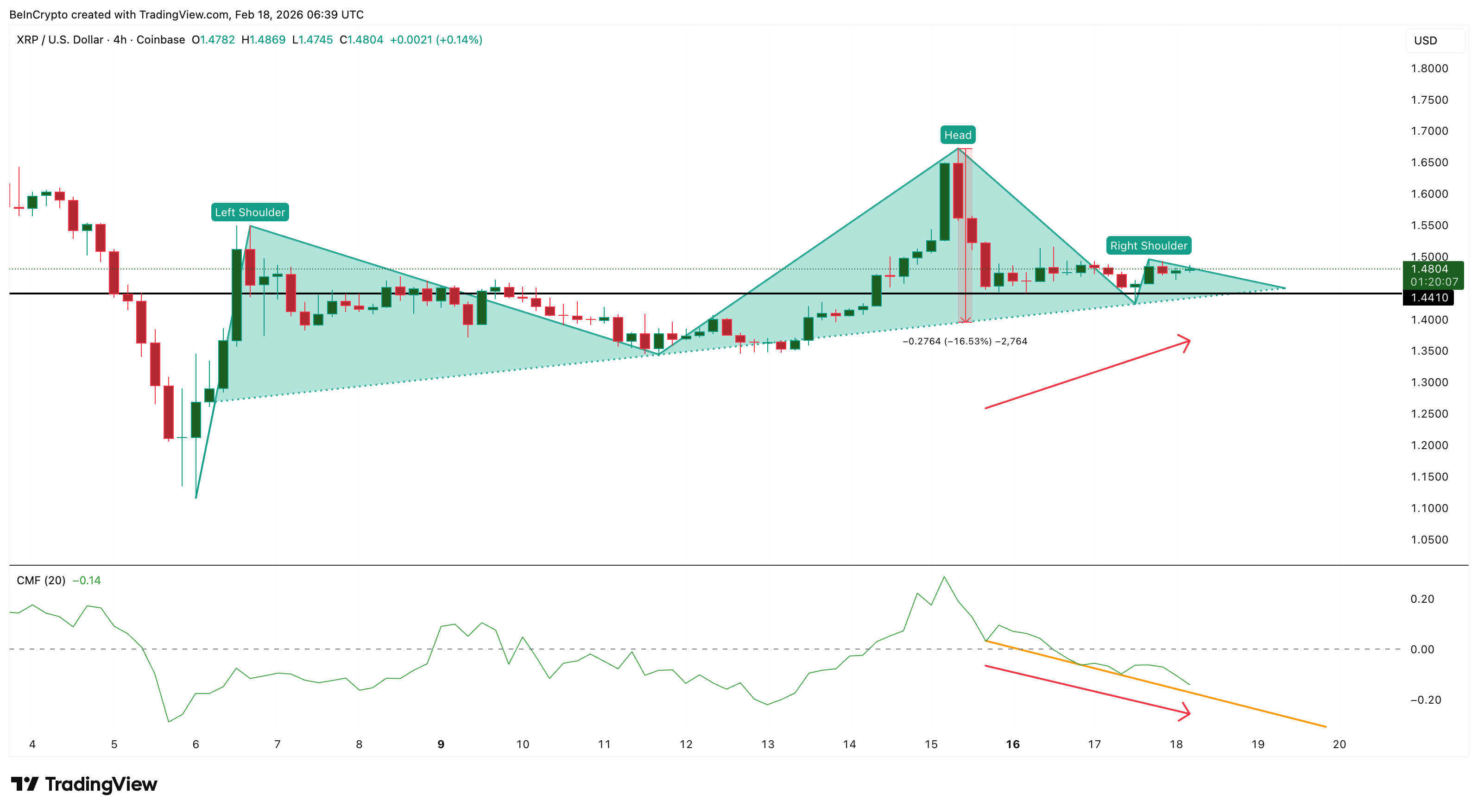 The four-hour chart reveals a concerning head and shoulders formation with its neckline positioned near $1.44. This classic reversal pattern suggests potential downside risk of approximately 16% if support levels fail. Since February 17, XRP has traded sideways as buyers attempt to invalidate the bearish structure.