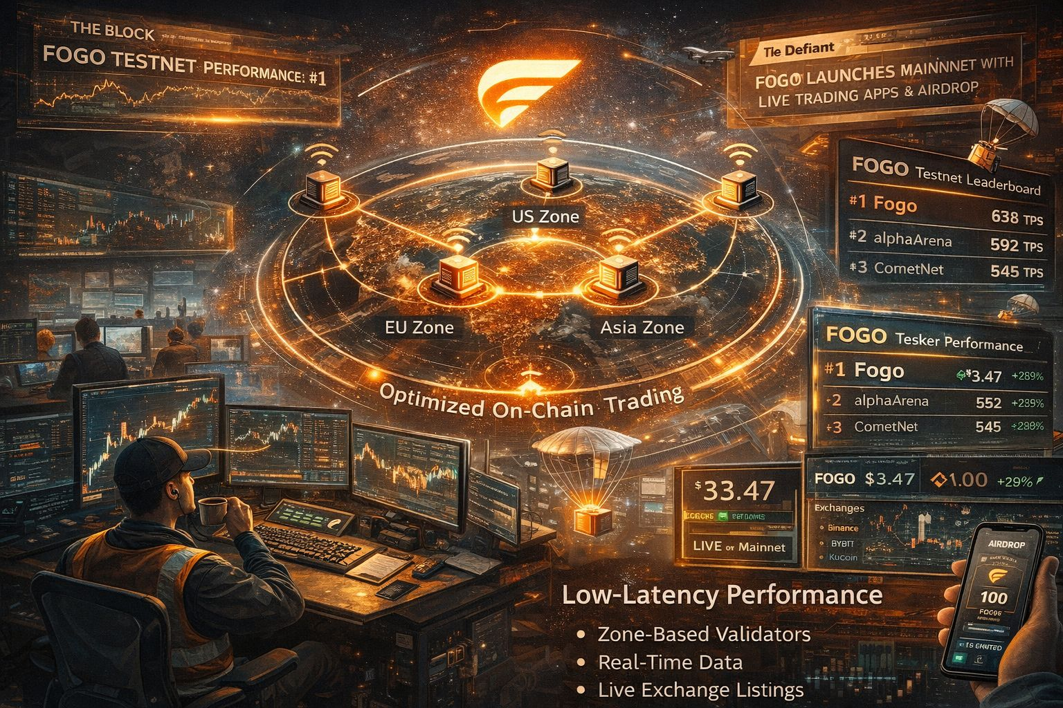 This is also why so much writing around Fogo keeps returning to trading as the “native” workload. Not “trading” as a vibe, but trading as an environment where microstructure matters: bursts of message traffic, adversarial ordering games, and sudden surges where a chain’s behavior under stress is more revealing than its behavior in a lab. The Block’s reporting around launch framed the project as explicitly targeting onchain trading and highlighted how its testnet performance was being tracked on public leaderboards prior to mainnet. The Defiant, covering the same period, emphasized that mainnet arrived with live apps, exchange listings, and an airdrop—signals that the team cared about “day one” market reality rather than a long, quiet runway.