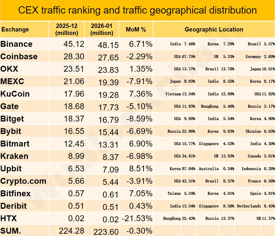 In January 2026, the website traffic of major exchanges decreased by approximately 0.3% compared with December 2025. The top three exchanges by month-on-month change were Upbit (+9%), KuCoin (+7%), and Bitfinex (+7%). The bottom three were HTX (-22%), Bitget (-9%), and MEXC (-8%).