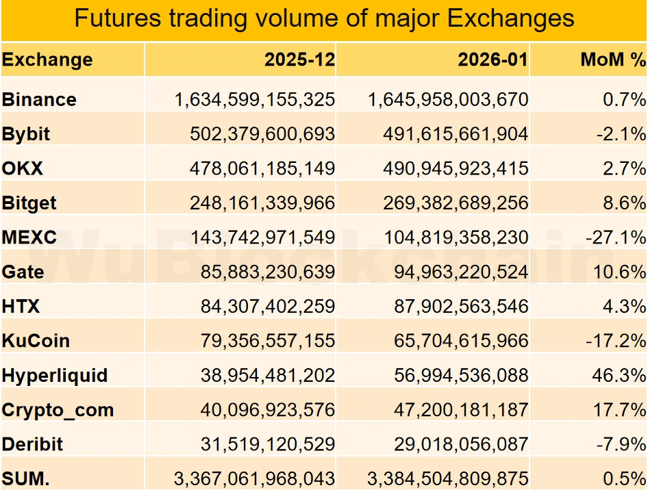 In January 2026, the derivatives trading volume of major exchanges increased by approximately 0.5% compared with December 2025. The top three exchanges by month-on-month change were Hyperliquid (+46%), Crypto.com (+18%), and Gate (+11%). The bottom three were MEXC (-27%), KuCoin (-17%), and Deribit (-8%).