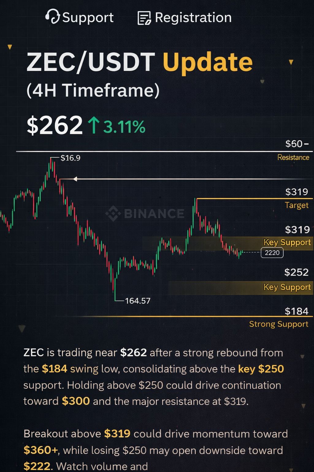 If $ZEC holds above $250, a bullish continuation toward $300–$319 is likely. A clean breakout above $319 could trigger momentum toward $360+. However, losing $250 may open downside toward $222.