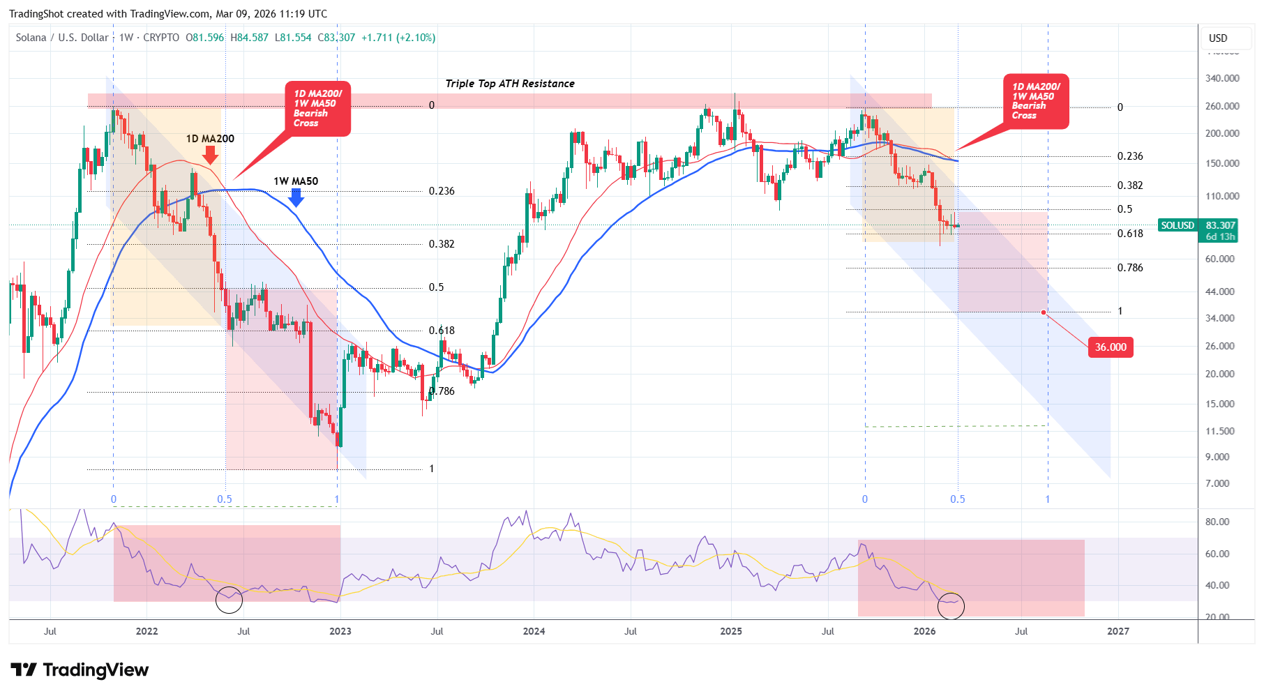 This resembles technically June 06 2022 during the previous Bear Cycle when SOL's 1W RSI also (almost turned oversold). That market the start of Stage 2 (red Rectangle) of the Bear Cycle, right on the 0.5 Time Fibonacci level.