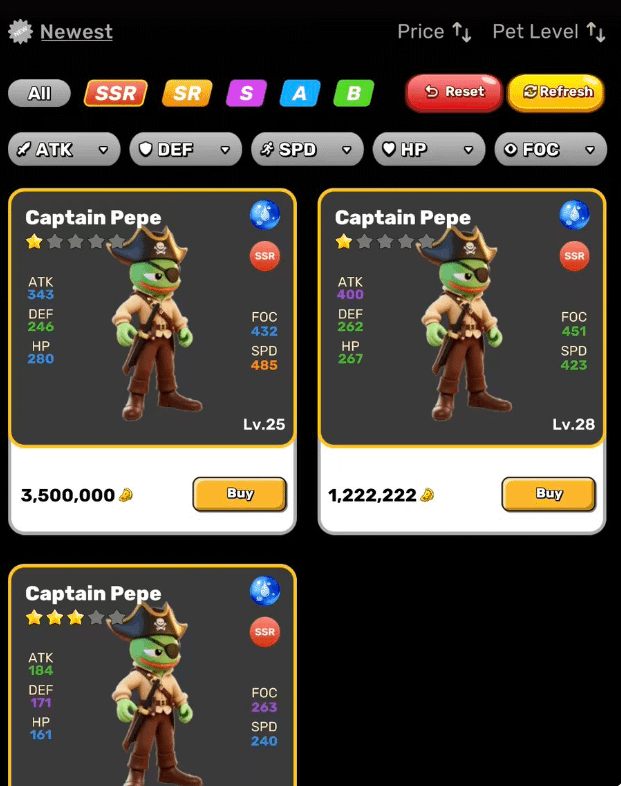 宠物升级:宠物等级上限=游戏等级。如果你的游戏等级是5级,那么你的宠物最多也只能升到5级。宠物升级需要碎片,碎片可以通过捕捉A以上稀有宠物才有机会获得,获得数量看运气。并且,还有机会获得其他MEME代币。