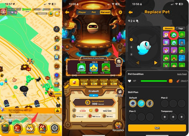 出门=赚钱:走路捕宠掉真实Meme Coins(DOGE/PEPE),部署Harvester离线挖Shards。