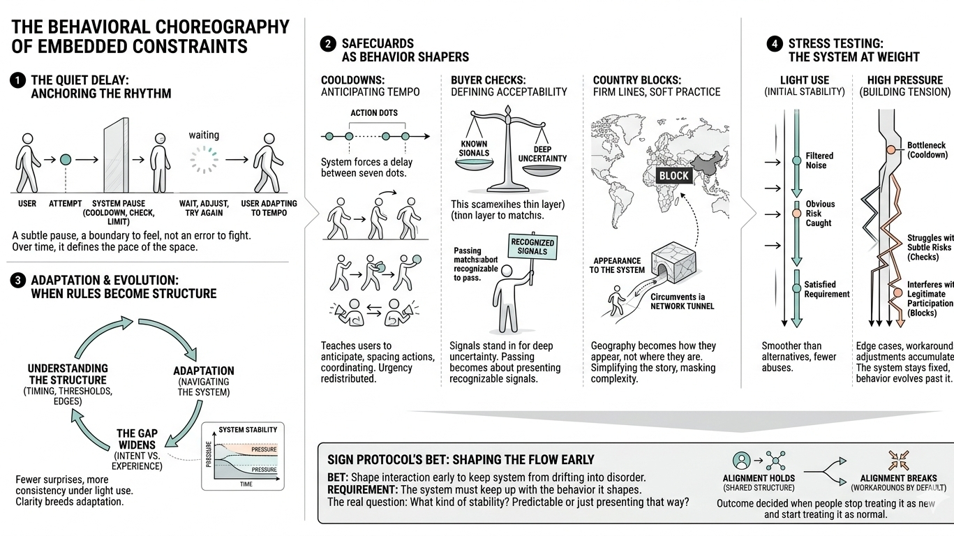 Cooldowns, buyer checks, country blocks on paper, these are safeguards. In practice, they shape behavior in subtle ways. A cooldown doesn’t just slow someone down; it teaches them to anticipate the system’s tempo. People begin spacing actions, coordinating across accounts, or simply accepting that speed is no longer an advantage in the same way. The urgency doesn’t disappear it gets redistributed. What looked like control is, in some sense, choreography.