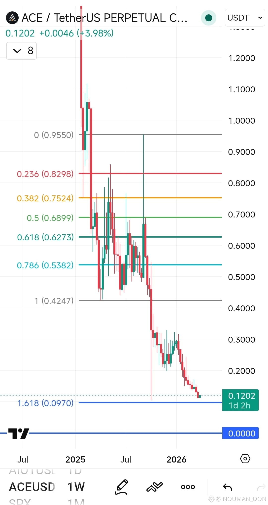 The current chart for ACE/USDT (Perpetual) on the weekly (1W) timeframe shows a significant prolonged downtrend, with the price recently finding a potential floor near the 1.618 Fibonacci Extension level.