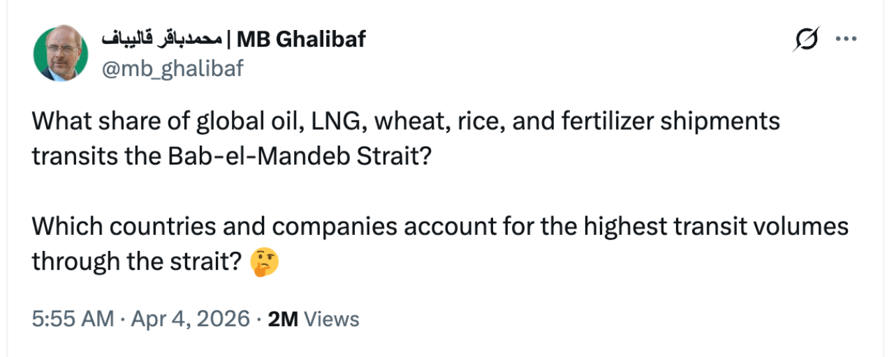 Ghalibaf questioned on social media platform X about the global share of oil, liquefied natural gas, wheat, rice, and fertilizer transported through the Mandeb Strait. He further inquired about which countries and companies have the highest shipping volumes through this route.
