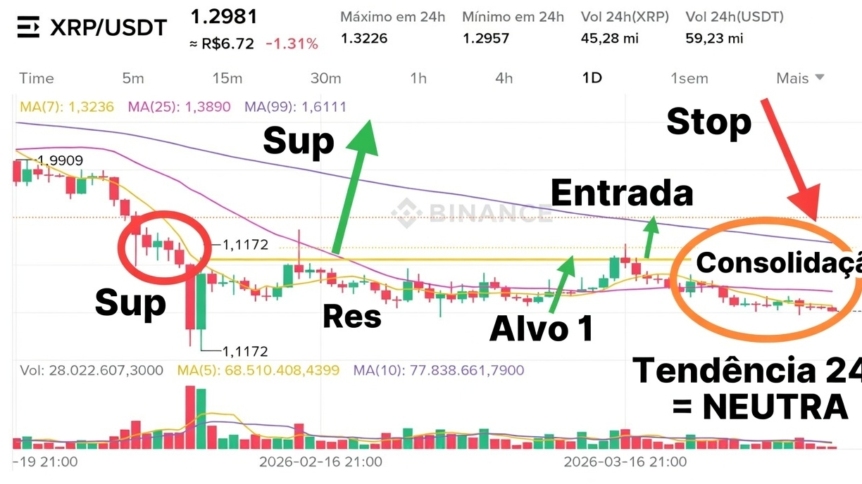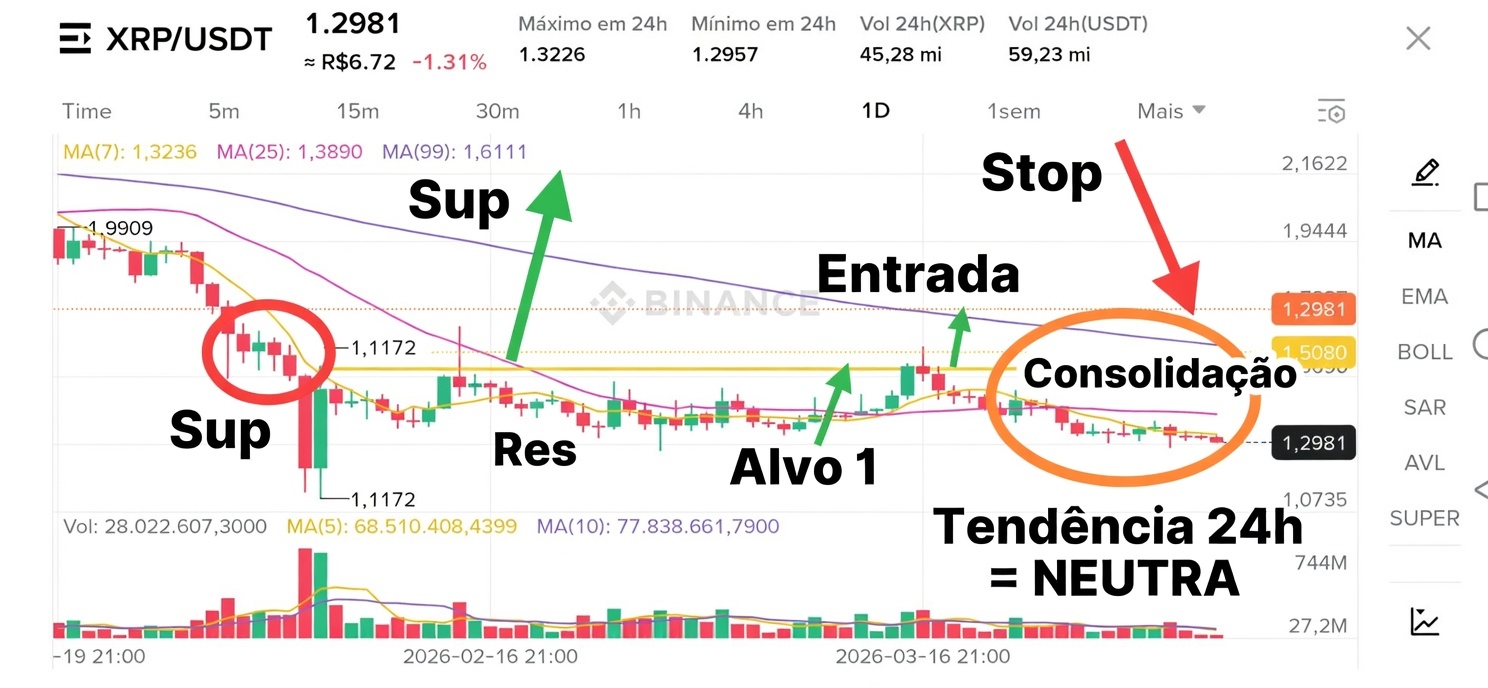 - MA(7): 1,3236 → preço está abaixo dela (resistência imediata forte).
