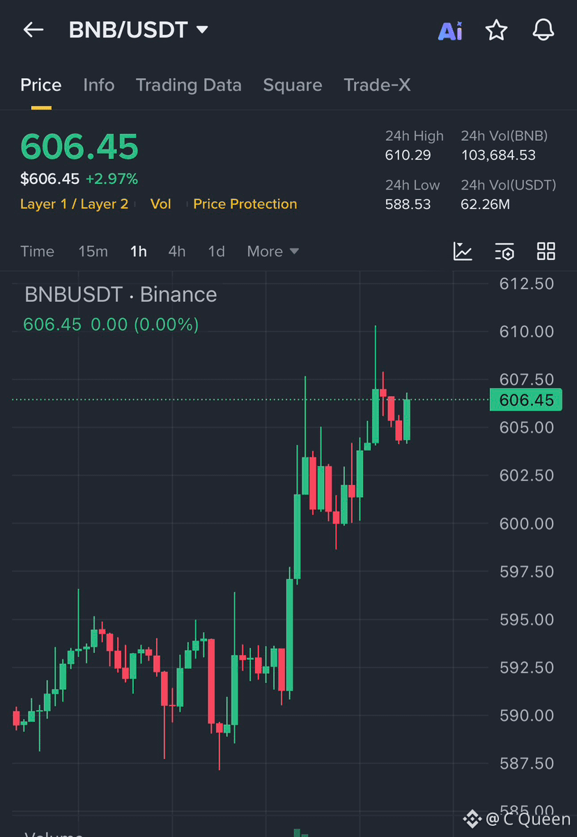 $BNB As of April 7, 2026, the live price of BNB (BNB) is approximately $597.52 USD. In the last 24 hours, the coin has seen a slight decline of about -0.93%, with a 24-hour trading volume of roughly $1.5 billion USD. The current market capitalization is around $81.5 billion USD, maintaining its position.