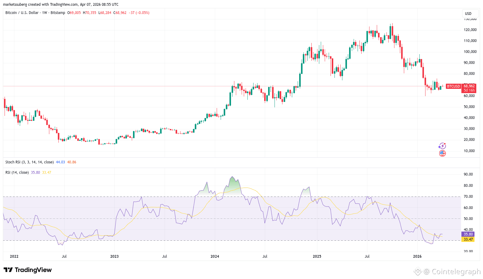 BTC/USD one-week chart with RSI data. Source: Cointelegraph/TradingView