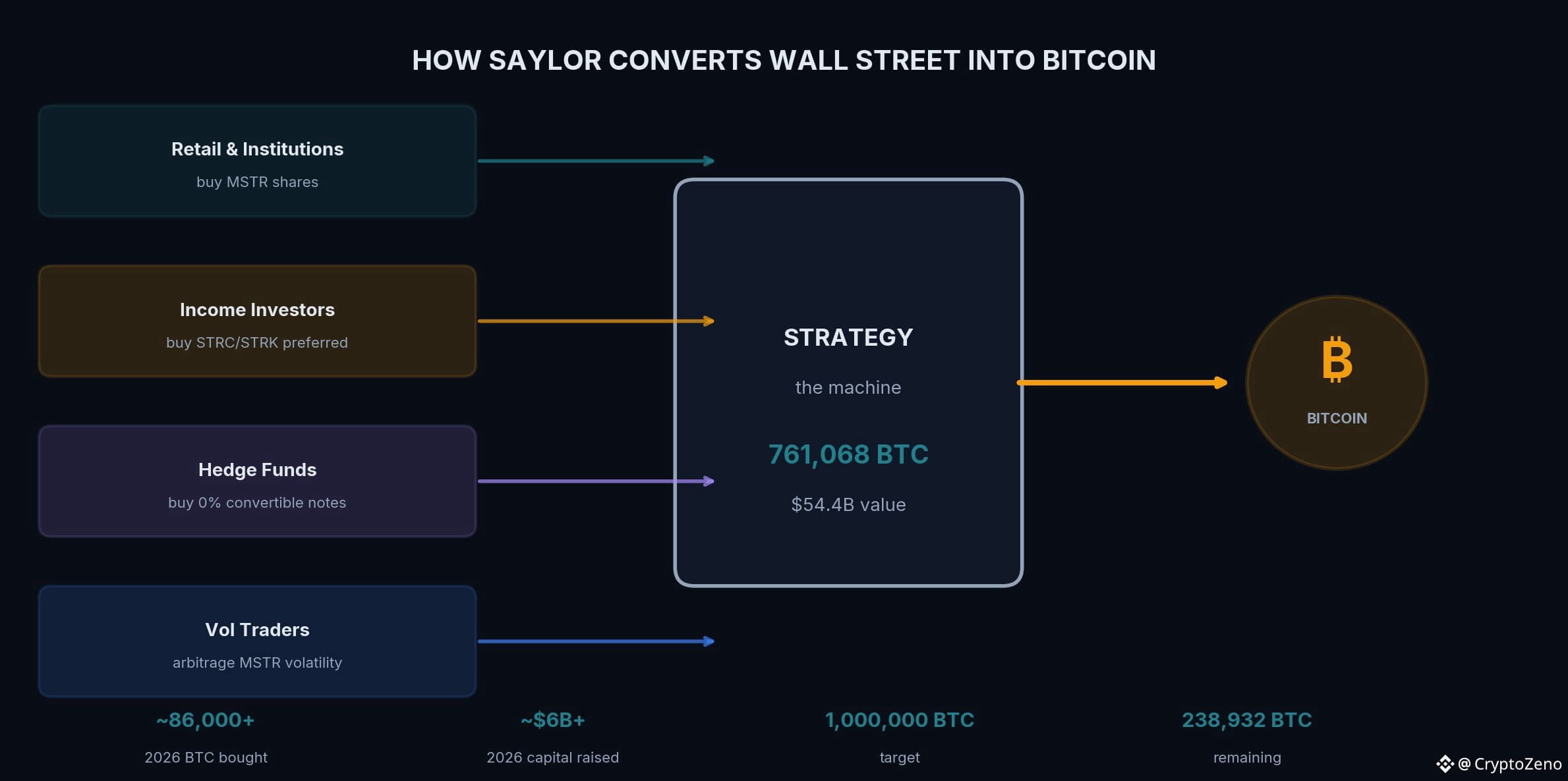 strategy's stated target: 1 million BTC by end of 2026. they're at 761,068 now. that's 238,932 more BTC needed. at ~$85K/coin, that's another ~$20 billion in 42 weeks.
