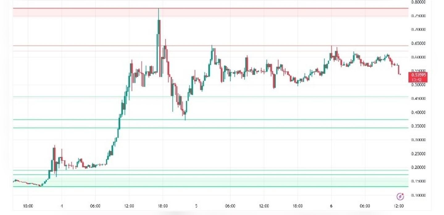 For a meaningful recovery, the asset must break out of this sideways structure and turn the $0.60 level into solid support. Until that happens, price action remains cautious, with the green support area around $0.50 acting as the main defense against further downside.