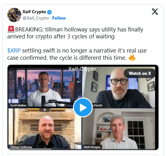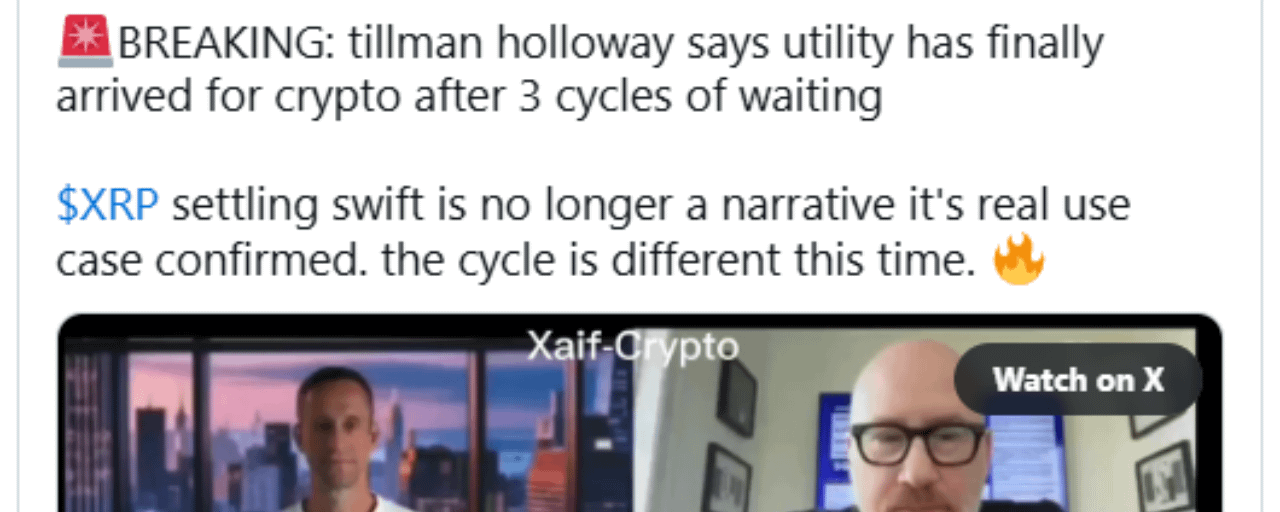 Crypto commentator Xaif drew attention to this transition by sharing insights from Tillman Holloway during a discussion on The Wolf of All Streets. Holloway stated that after three market cycles of anticipation, crypto utility has finally materialized. He pointed specifically to XRP, arguing that its role in settling transactions alongside SWIFT has moved beyond narrative into confirmed application.