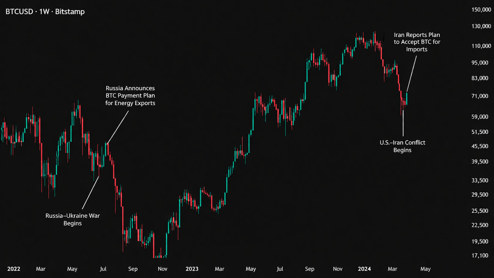 Nếu còn nhớ, vào tháng 2/2022, Bitcoin cũng tạo đáy đúng vào thời điểm thị trường hoảng loạn nhất rồi bắt đầu phục hồi. Chỉ khoảng 4 tuần sau, thông tin Nga cân nhắc chấp nhận thanh toán Bitcoin cho dầu mỏ và khí đốt xuất hiện, khiến tâm lý thị trường đảo chiều rất nhanh.