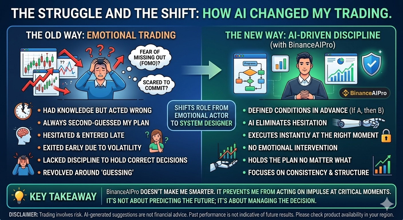Với thị trường này có lẽ mình là người đã từng thua rất nhiều. Và mình từng nghĩ việc thua trong trading là do thiếu kiến thức. Mình học thêm indicator, xem nhiều phân tích hơn, nhưng kết quả vẫn vậy: vào lệnh xong là sai nhịp. Sau này mình mới nhận ra, vấn đề không nằm ở việc “không biết”, mà là biết nhưng không làm đúng lúc. Mình có kế hoạch, nhưng khi thị trường chạy thật, mình luôn tìm cách bẻ cong chính kế hoạch đó. Và đó là lúc mình bắt đầu nhìn nhận lại vai trò của những công cụ như BinanceAIPro.