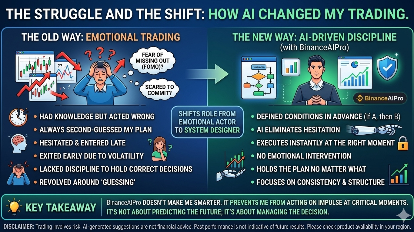 Điều mình thấy rõ nhất là BinanceAIPro không làm mình thông minh hơn, nhưng nó không cho mình cơ hội hành động ngu đi ở những thời điểm quan trọng. Khi tự trade, mỗi lần vào lệnh là một cuộc giằng co: vào thì sợ sai, không vào thì sợ lỡ. Chính sự do dự đó khiến mình luôn vào muộn hoặc vào sai thời điểm. Nhưng khi chuyển sang việc định nghĩa điều kiện rõ ràng cho AI kiểu “nếu A xảy ra thì làm B” mình nhận ra mình không còn phải tranh cãi với chính mình nữa. Quyết định được đưa ra khi đầu óc còn tỉnh táo, không phải khi thị trường đang gây áp lực.